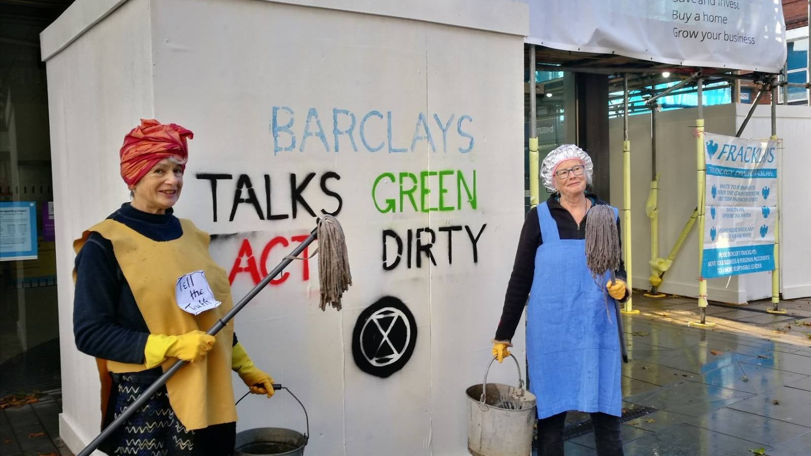 Lincolnshire Rebels scrub the bank to call out their greenwashing and dirty tricks. Barclays promised to go green but are one of the biggest funders of fossil fuel companies.